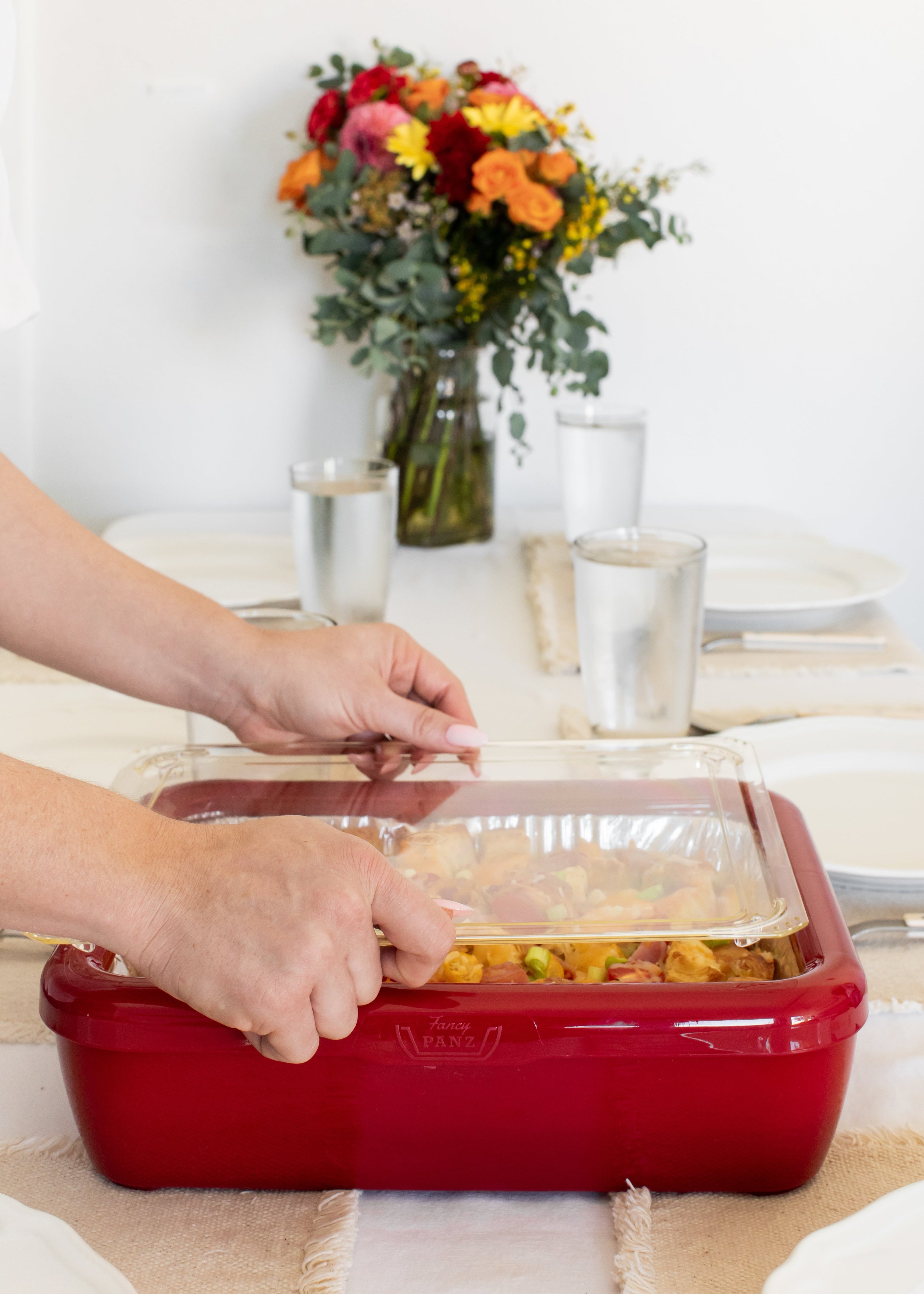 Serve your dish by removing the clear cover and placing underneath your Fancy Panz as a trivet.